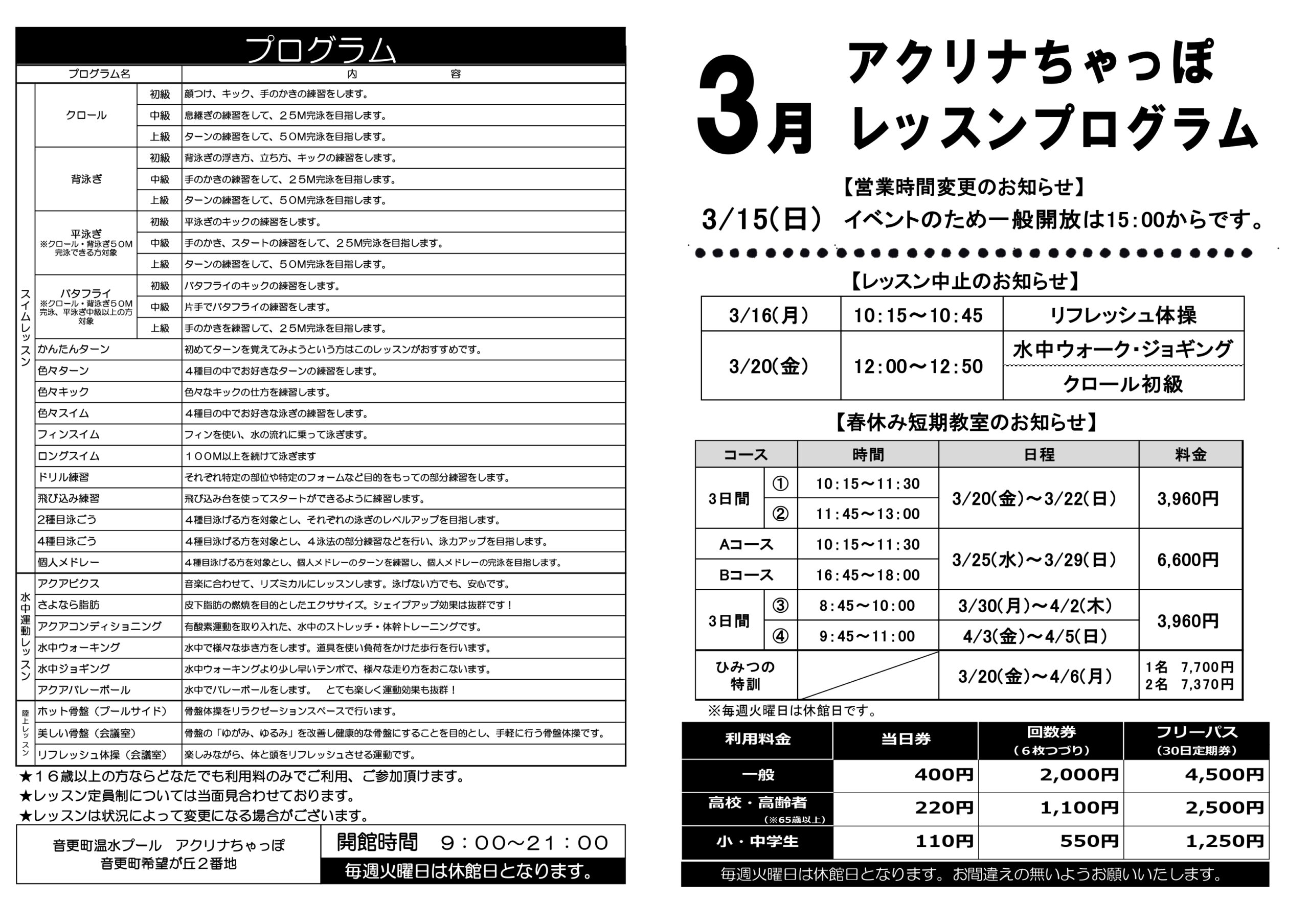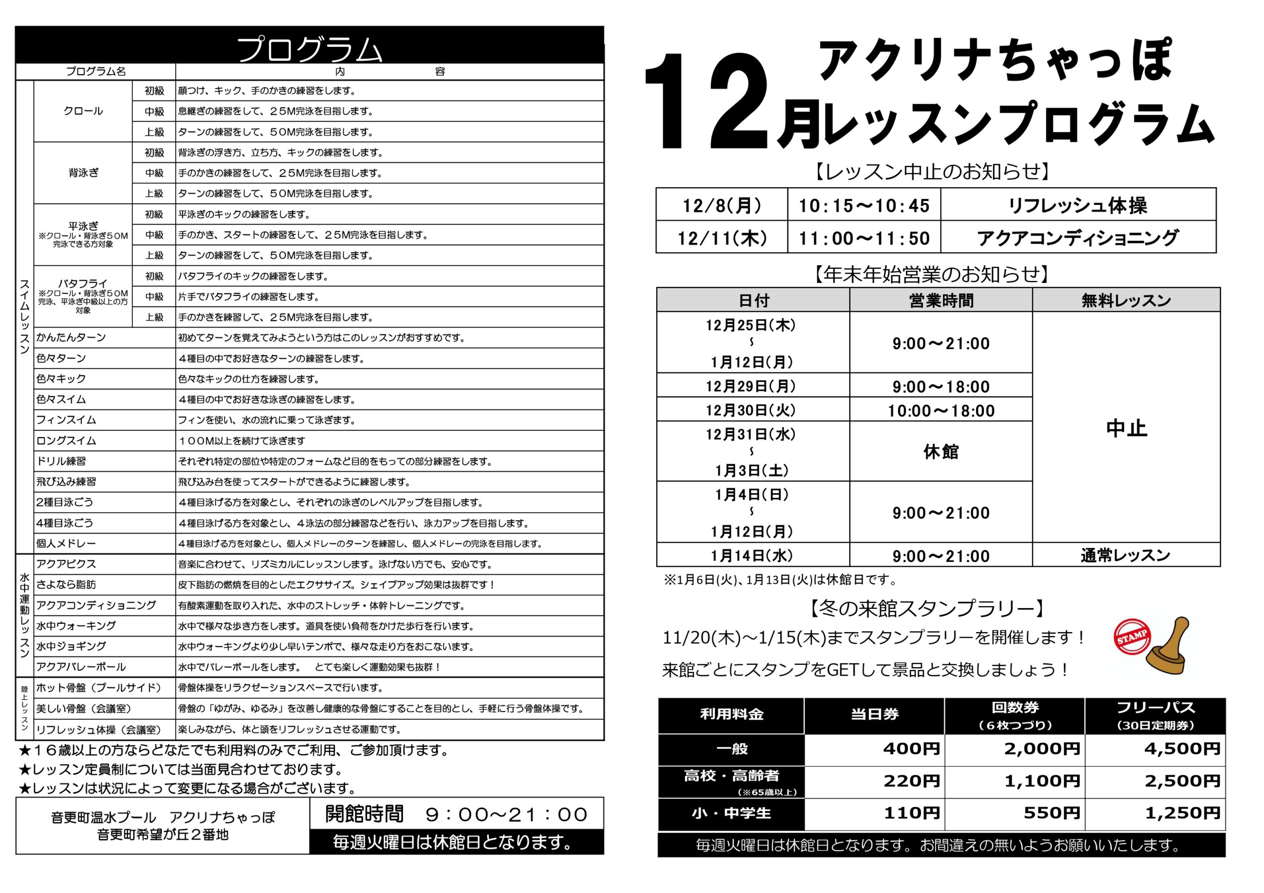 | 休日 | 毎週火曜日(祝祭日の場合はその翌日)、年末年始(12月31日〜1月3日)、機械整備期間(2月1日〜2月末日) |