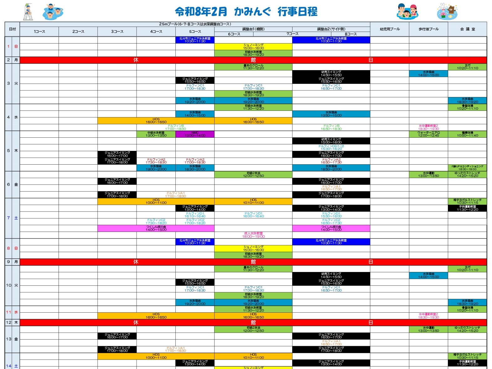 | 施設内容 | 主体プール:25mプール8コース(内 赤台設置2コース) 幼児用プール・歩行浴プール(曜日により流水マシン設置可)・採暖室 1F/事務室・男子更衣室・女子更衣室(男女共シャワー室あり)・身障者用トイレ・ボイラー室 2F/会議室・観覧スペース・電気室 |