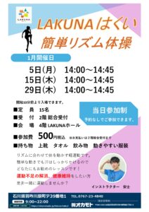 LAKUNAはくいの4階ホールでリズム体操を実施します。