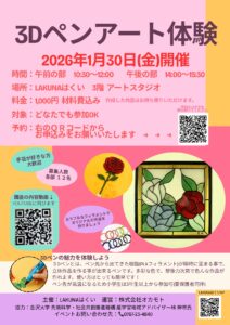 3Dペンとは、ペン先から出てきた樹脂(PLAフィラメント)が瞬時に固まる事で、立体作品を作るペンです。多彩な色で、想像力次第で色んな作品が作れます。使い方はとっても簡単です!※ペン先が高温になるため小学生は3年生以上から参加可(要保護者同伴)
