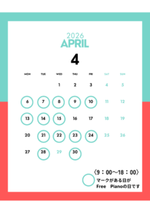 4月のフリーピアノ実施予定日をご案内いたします。