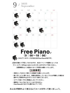 〈9月〉フリーピアノのご案内 会期: 9月中 場所: 1階 交流ホール 9月のフリーピアノ実施予定日をご案内いたします。 Free Piano 2025 – 9月 なお、8月31日現在の予定ですので、交流ホールのご予約が入った場合や、 貸室利用の方のご要望で中止になる事がございます。 フリーピアノのご利用をご希望の方は、利用日当日にお電話で確認していただく事をお勧めいたします。 ご理解、ご了承のほどお願いいたします。