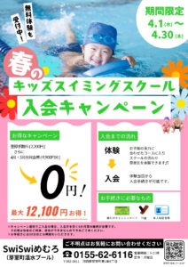 4月レッスン休講追加のお知らせ 2026 4/11 2026年4月11日 お知らせ よかったらシェアしてね! URLをコピーしました! URLをコピーしました! 春のキッズスイミングスクール入会キャンペーン