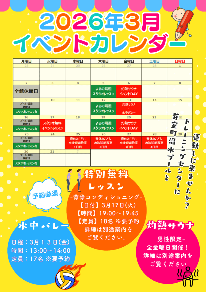 【水中バレー】 【日時】3月13日(金) 13:00~14:00 【定員】17名(要予約)※... -