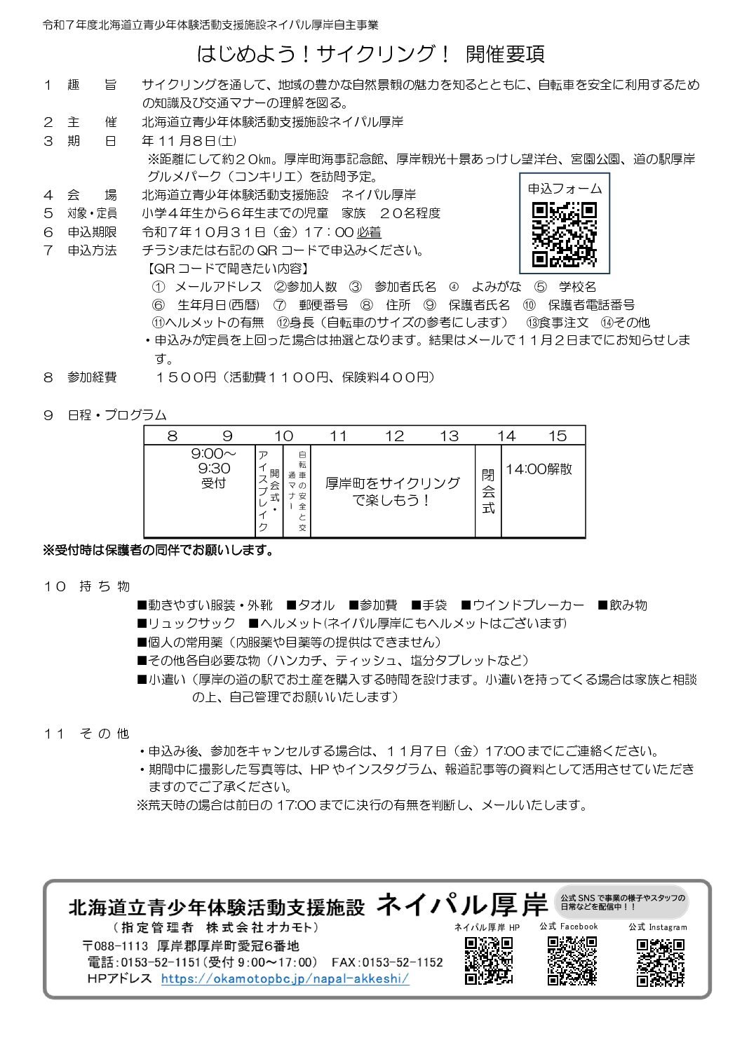 この度は令和7年度自主企画事業「はじめよう!サイクリング!」の開催要項及びチラシを掲載します。
