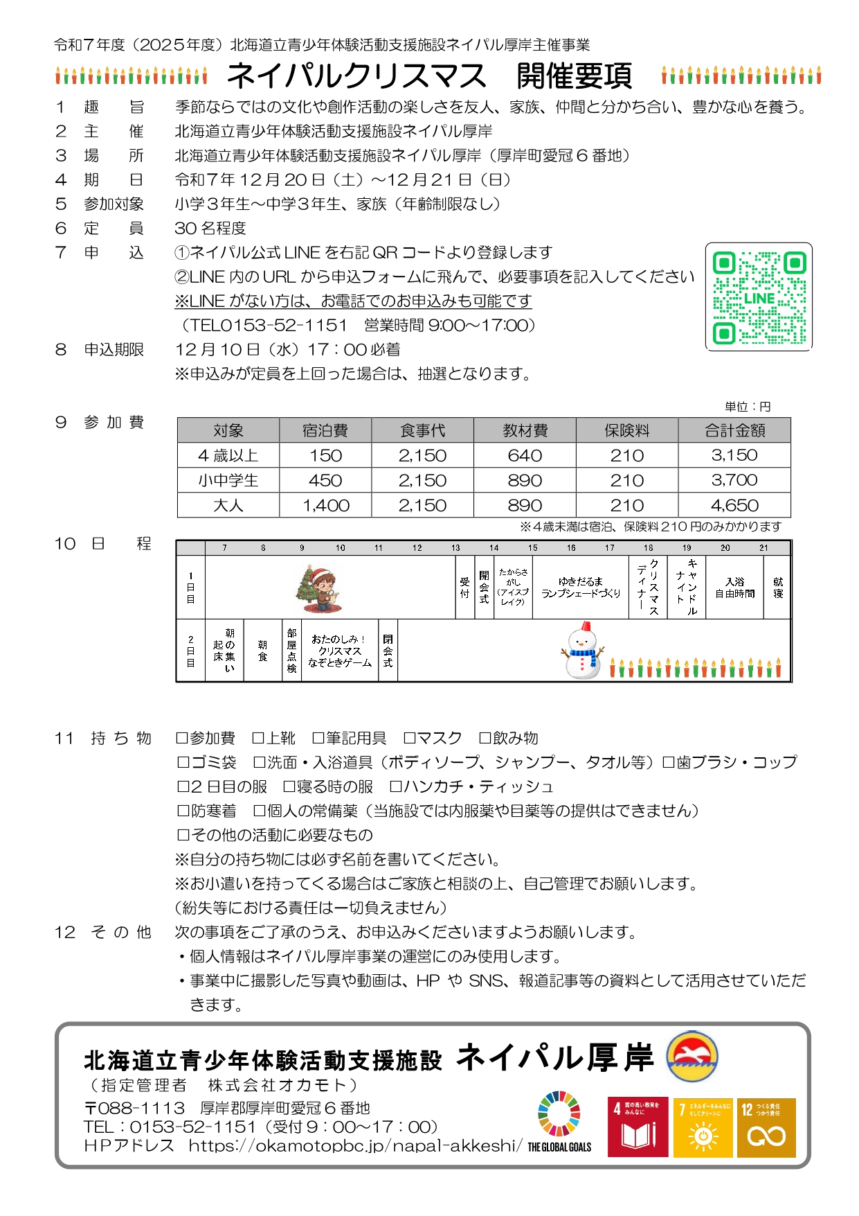 | 期 日 | 令和7年12月20日(土)~21日(日)1泊2日 |