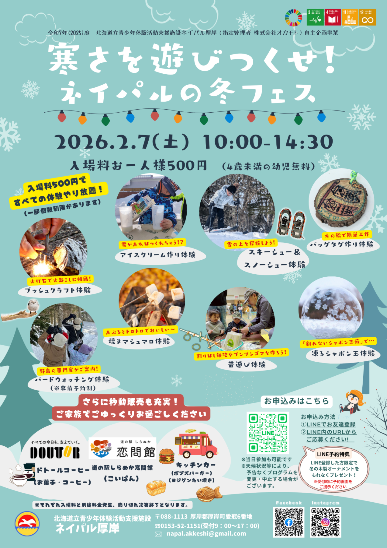| 期 日 | 令和7年2月7日(土)10:00~14:30 日帰り ※好きな時間にお越しください。 |