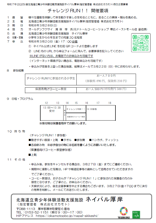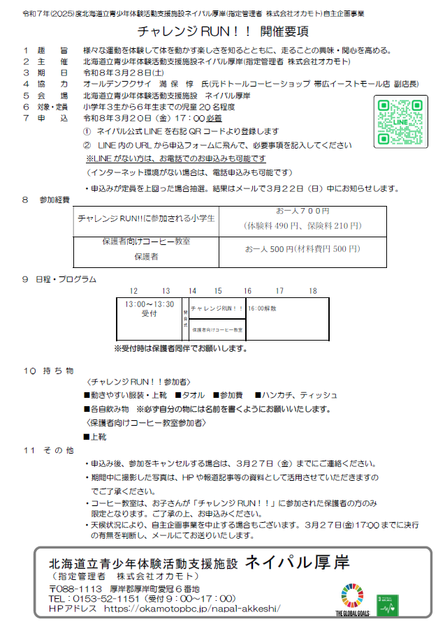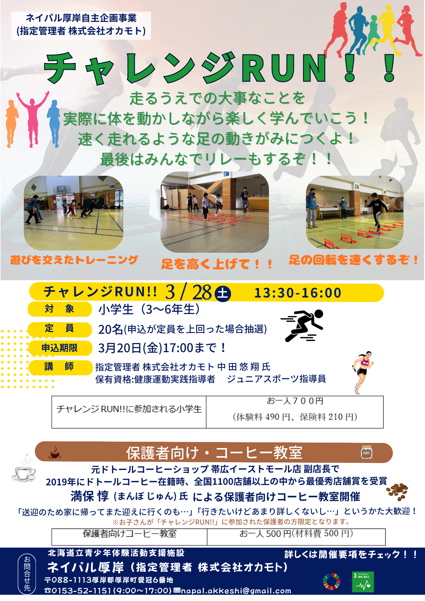 | 参加費 | チャレンジRUN!!・・・お一人700円 保護者向けコーヒー教室 ・・・お一人500円 |