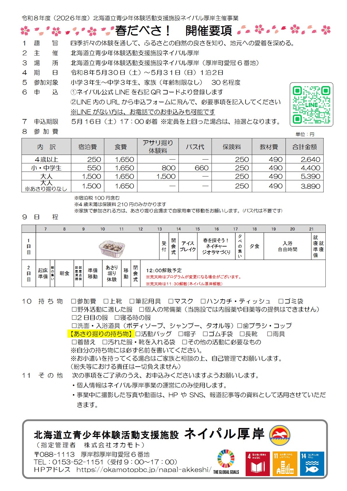 | 参加費 | 3歳以下:210円 4歳以上:2,640円 小中学生:4,400円 大人:5,390円 大人(あさり掘りなし)3,890円 |