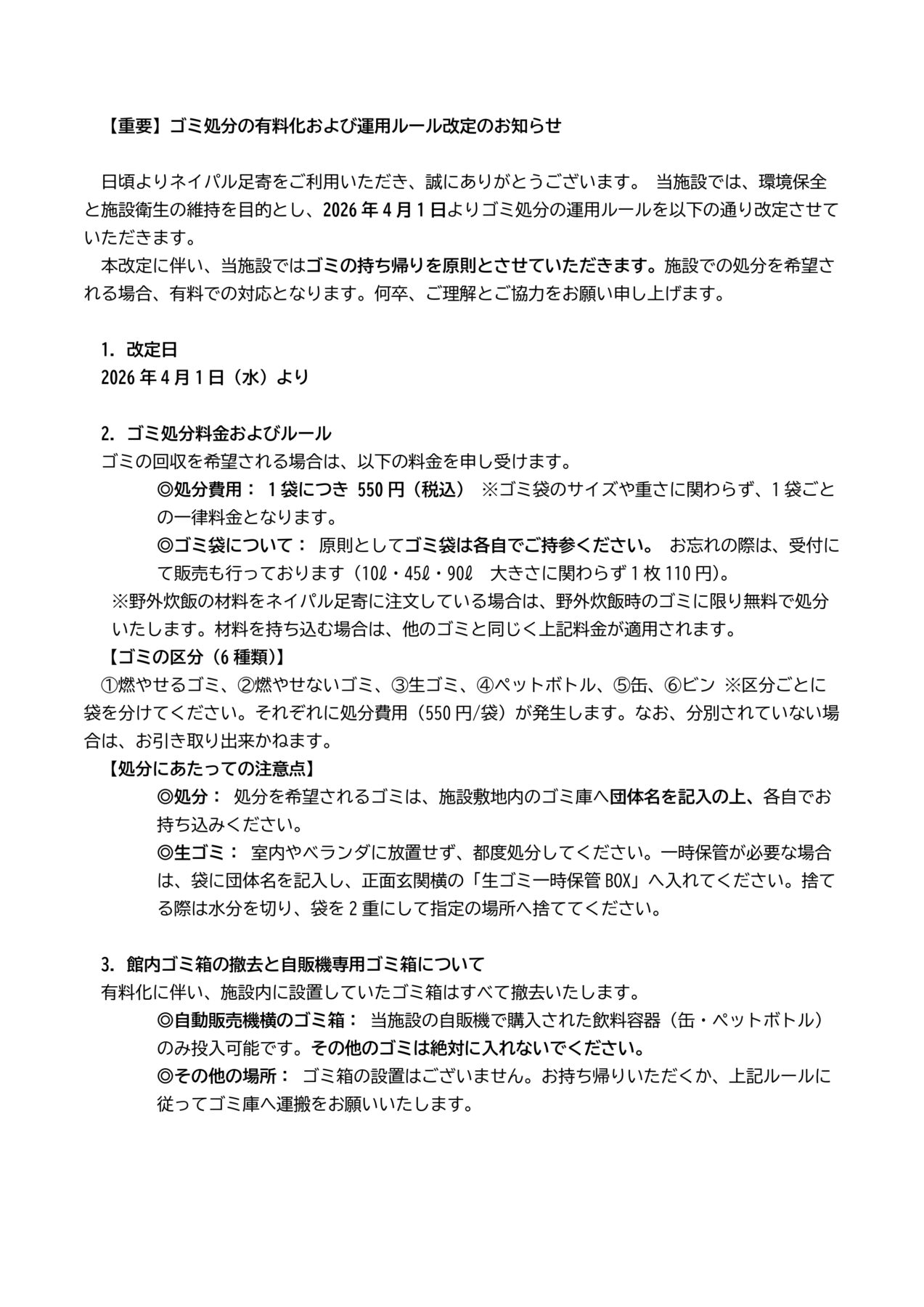 日頃よりネイパル足寄をご利用いただき、誠にありがとうございます。 当施設では、環境保全と施設衛生の維持を目的とし、2026年4月1日(水)よりゴミ処分の運用ルールを以下の通り改定させていただきます。
