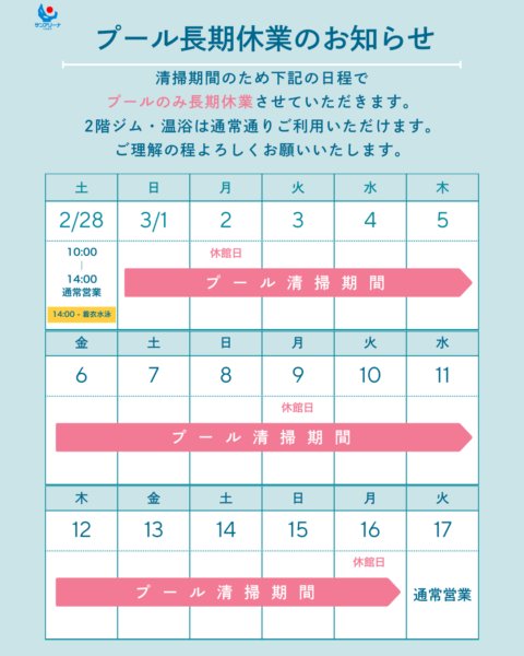 休館日|毎週月曜日(祝祭日の場合はその翌日)、年末年始、プール清掃期間(3月1日から3月15日まで)