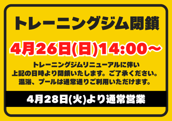 4月26日(日)14:00~ジム閉鎖