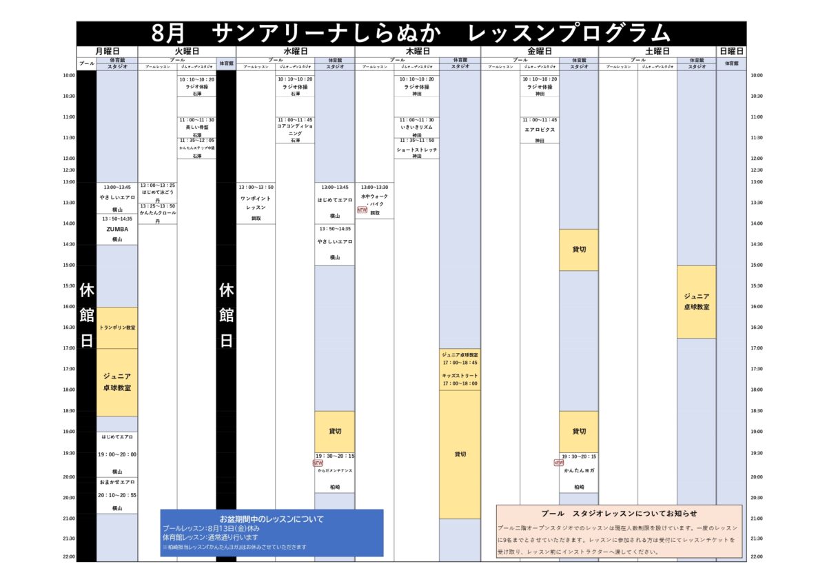 2021年8月レッスンプログラム|白糠総合体育館・温水プール