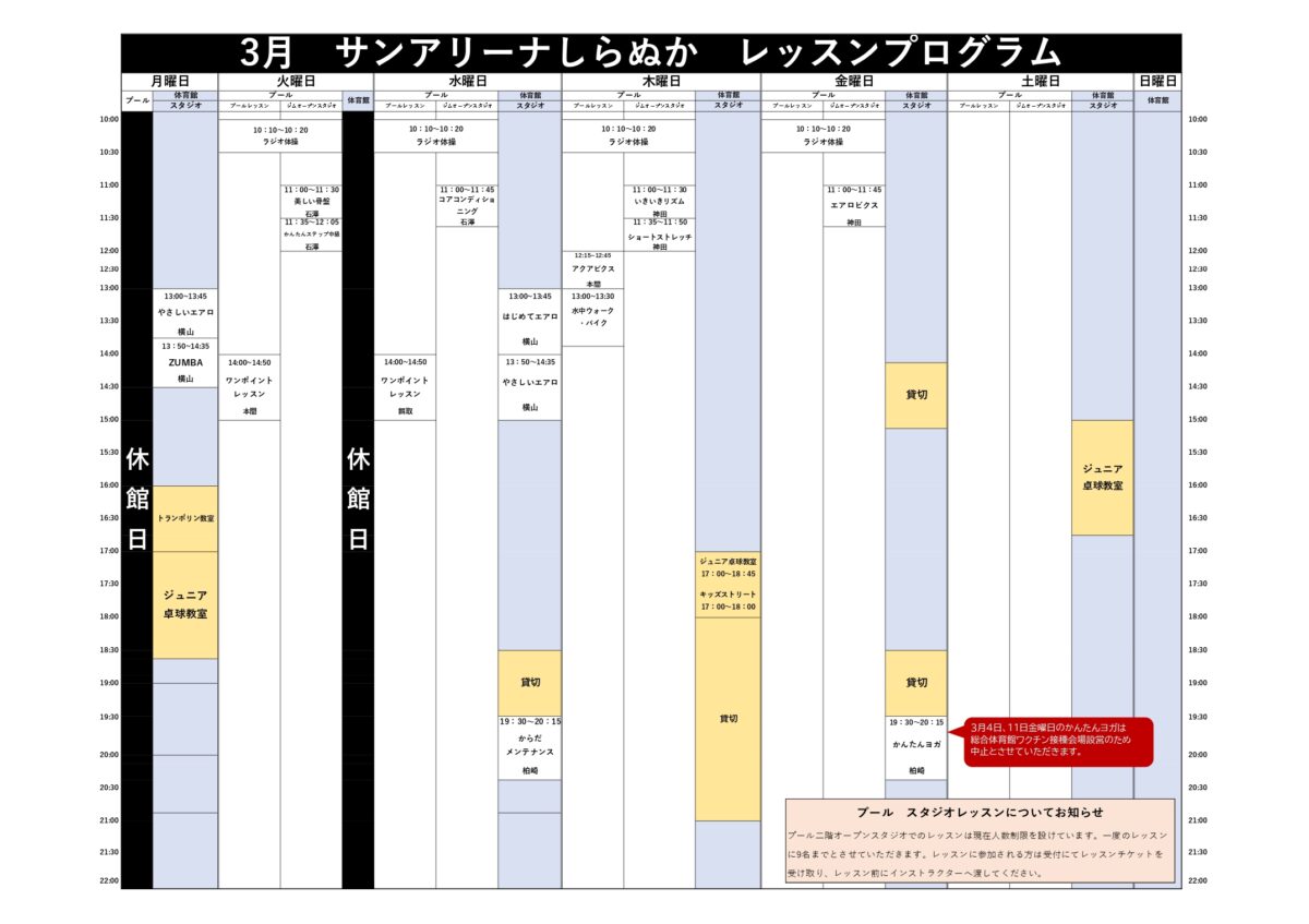 2022年3月レッスンプログラム|白糠町総合体育館・温水プール