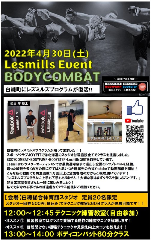 北海道内各地で人気を博したインストラクター 岸 裕太によるボディコンバットのお披露目レッスンを4月30日(土)12:00より開催致します。