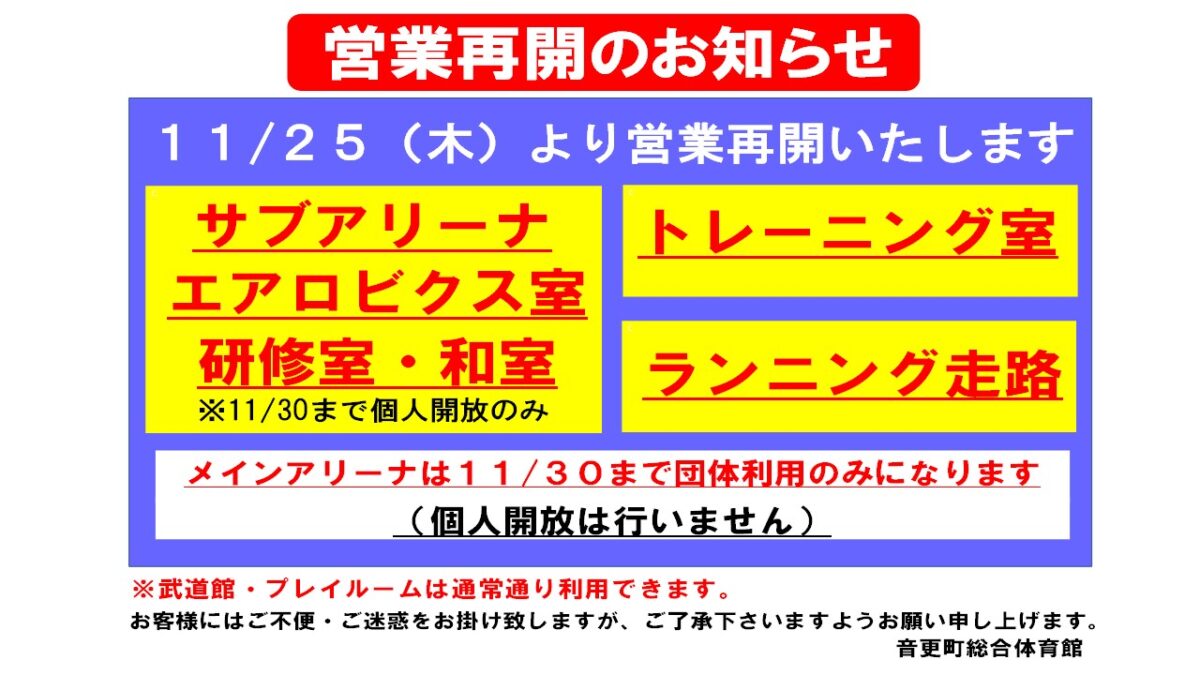 公開日:2021年11月20日(土曜日) スライド4 【音更町総合体育館営業再開のご案内】 サンドーム音更の人気の記事 2024年7月10日 アリーナ・サブアリーナ利用予定表 (7/10現在) 2019年6月27日 サンサン運動教室の製作活動| 今月のテーマは「かき氷・ペンギン」 2020年6月8日 【一般使用状況】 2019年12月1日 音更町総合体育館 12月レッスンプログラム 2020年3月3日 【臨時休館のお知らせ(新型コロナウイルス感染拡大防止)】 2018年8月28日 スケート教室を開催します!! 知りたい情報をさがす 目的から施設を探す 個人で利用する 団体で利用する 教室をさがす