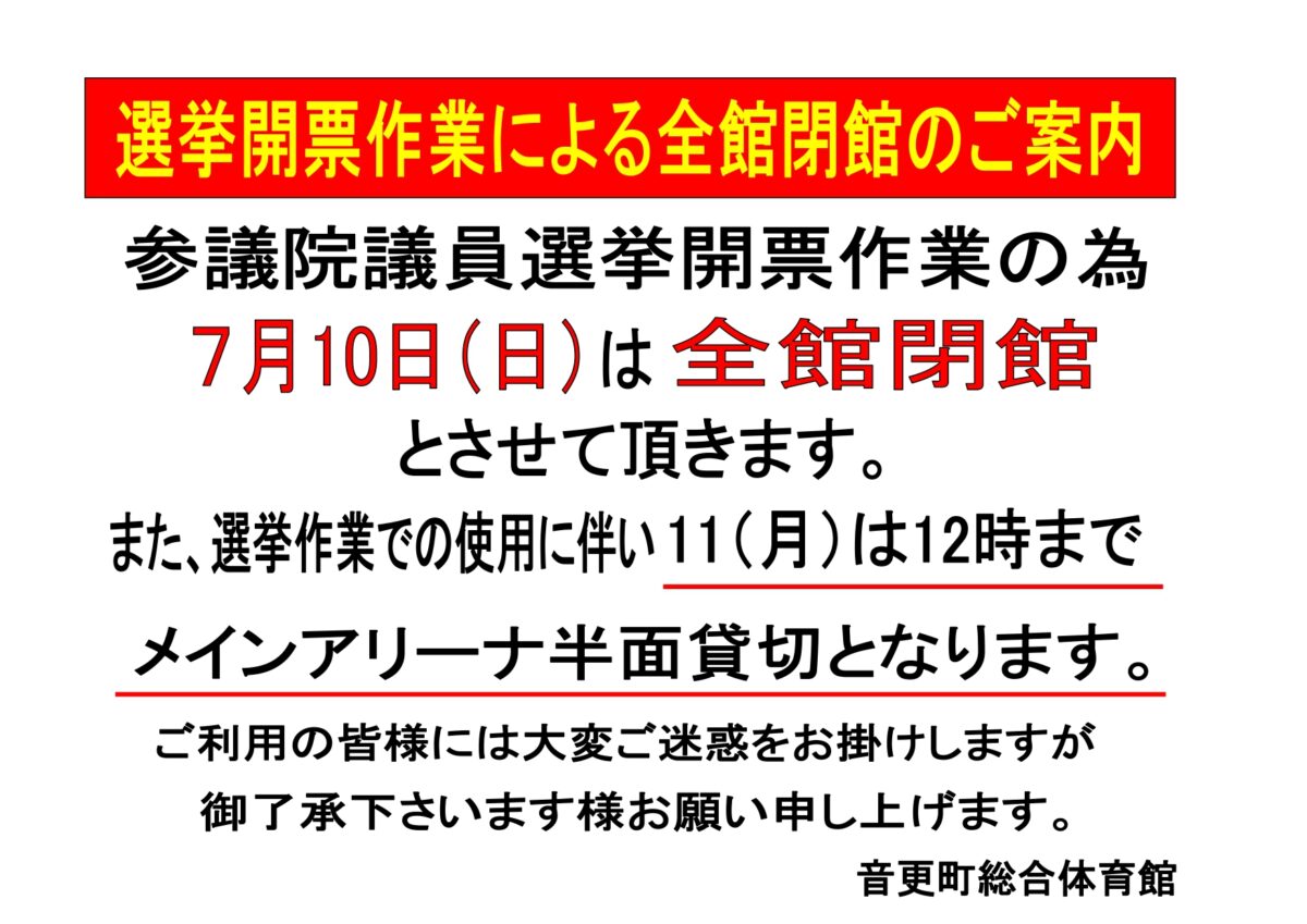 公開日:2022年07月06日(水曜日) 2022 選挙玄関用 pop_page-0001 選挙開票作業による全館閉館のご案内 サンドーム音更の人気の記事 2026年3月12日 【春の短期教室のお知らせ】 2024年7月10日 アリーナ・サブアリーナ利用予定表 (7/10現在) 2019年6月27日 サンサン運動教室の製作活動| 今月のテーマは「かき氷・ペンギン」 2020年6月8日 【一般使用状況】 2019年12月1日 音更町総合体育館 12月レッスンプログラム 2020年3月3日 【臨時休館のお知らせ(新型コロナウイルス感染拡大防止)】 2018年8月28日 スケート教室を開催します!! 知りたい情報をさがす 目的から施設を探す 個人で利用する 団体で利用する 教室をさがす