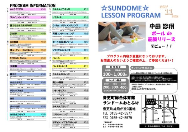 公開日:2022年10月25日(火曜日) 【音更体育館】11月表 音更町総合体育館 11月レッスンプログラム サンドーム音更の人気の記事 2026年3月12日 【春の短期教室のお知らせ】 2024年7月10日 アリーナ・サブアリーナ利用予定表 (7/10現在) 2019年6月27日 サンサン運動教室の製作活動| 今月のテーマは「かき氷・ペンギン」 2020年6月8日 【一般使用状況】 2019年12月1日 音更町総合体育館 12月レッスンプログラム 2020年3月3日 【臨時休館のお知らせ(新型コロナウイルス感染拡大防止)】 2018年8月28日 スケート教室を開催します!! 知りたい情報をさがす 目的から施設を探す 個人で利用する 団体で利用する 教室をさがす