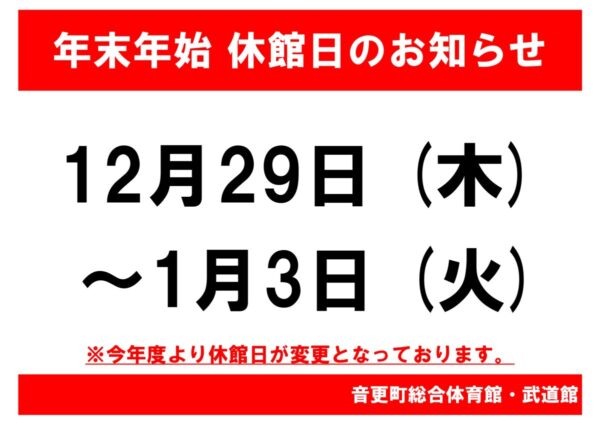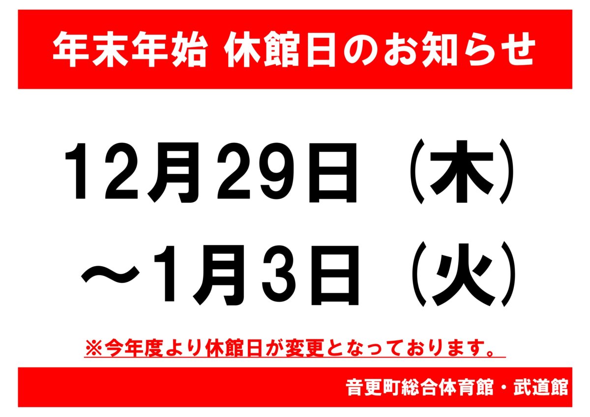 公開日:2022年11月22日(火曜日) 年末年始休館日POP_page-0001 (1) 【重要】年末年始 休館日のお知らせ サンドーム音更の人気の記事 2026年3月12日 【春の短期教室のお知らせ】 2024年7月10日 アリーナ・サブアリーナ利用予定表 (7/10現在) 2019年6月27日 サンサン運動教室の製作活動| 今月のテーマは「かき氷・ペンギン」 2020年6月8日 【一般使用状況】 2019年12月1日 音更町総合体育館 12月レッスンプログラム 2020年3月3日 【臨時休館のお知らせ(新型コロナウイルス感染拡大防止)】 2018年8月28日 スケート教室を開催します!! 知りたい情報をさがす 目的から施設を探す 個人で利用する 団体で利用する 教室をさがす