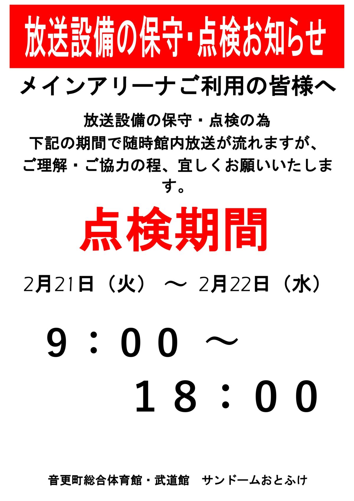 2月21日(火)~2月22日(水)の期間、放送設備の保守・点検の為