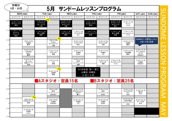 公開日:2023年04月23日(日曜日) 【音更体育館】5月裏_page-0001 音更町総合体育館 5月レッスンプログラム サンドーム音更の人気の記事 2024年7月10日 アリーナ・サブアリーナ利用予定表 (7/10現在) 2019年6月27日 サンサン運動教室の製作活動| 今月のテーマは「かき氷・ペンギン」 2020年6月8日 【一般使用状況】 2019年12月1日 音更町総合体育館 12月レッスンプログラム 2020年3月3日 【臨時休館のお知らせ(新型コロナウイルス感染拡大防止)】 2018年8月28日 スケート教室を開催します!! 知りたい情報をさがす 目的から施設を探す 個人で利用する 団体で利用する 教室をさがす