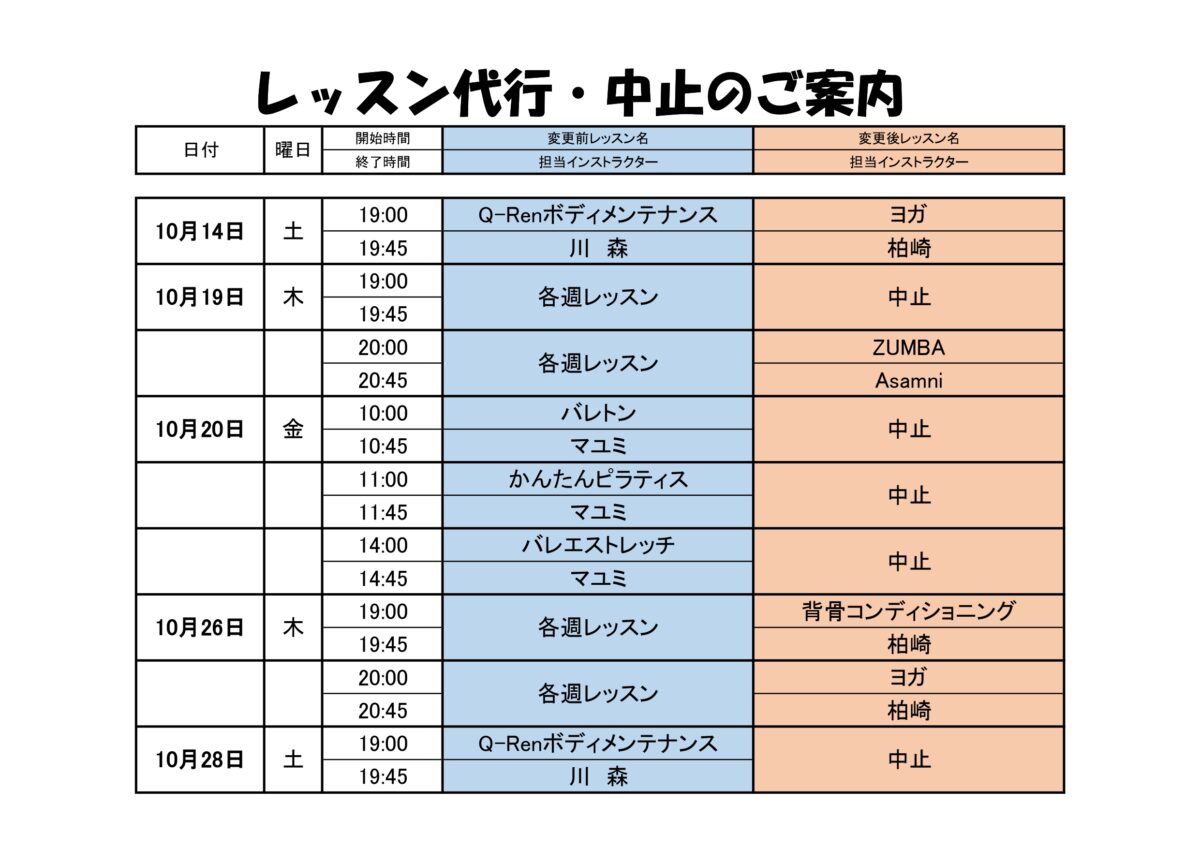 スタジオレッスン代行のお知らせ