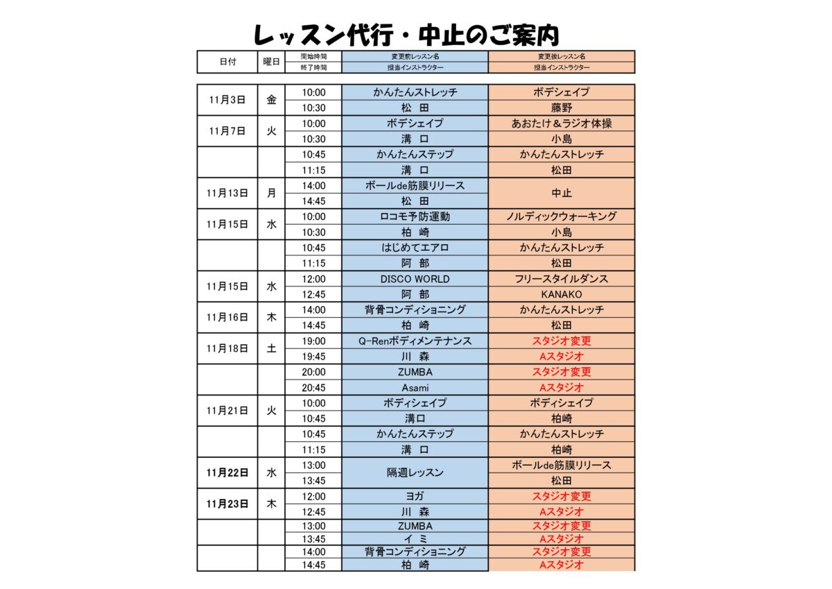 【11月スタジオレッスン代行のお知らせ】