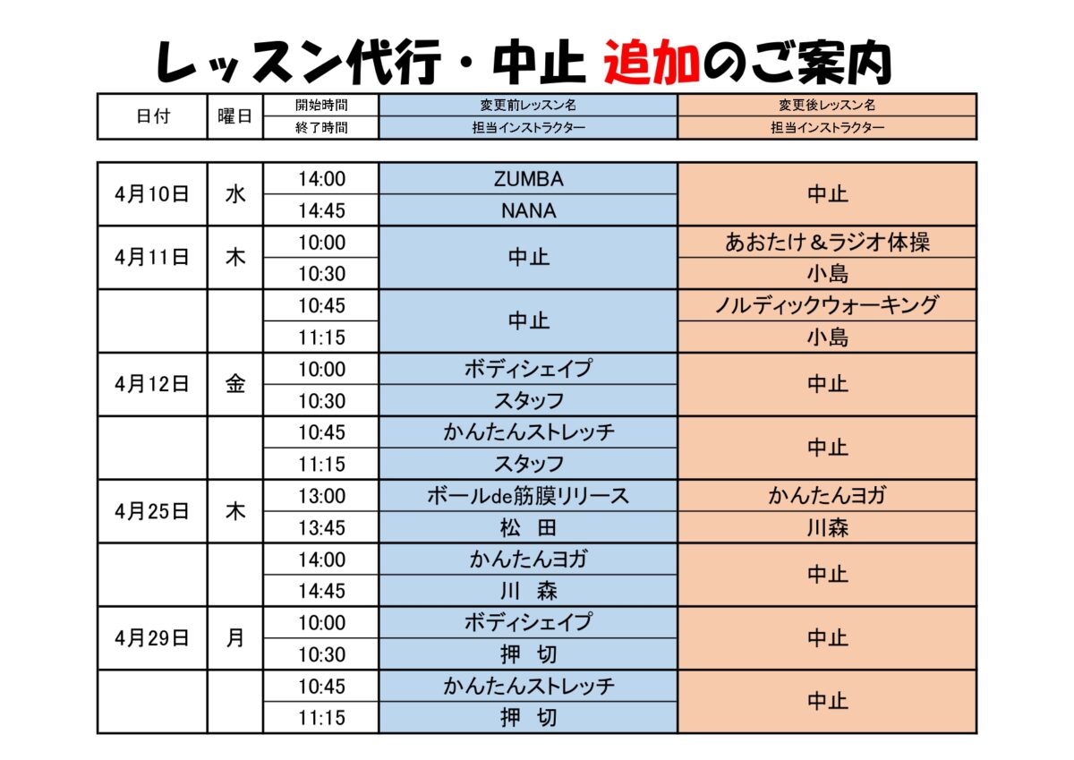 スタジオレッスン代行・中止のお知らせ