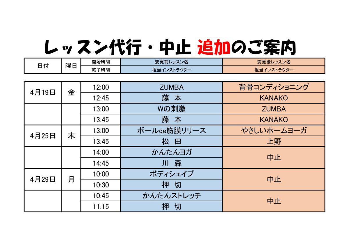 スタジオレッスン代行・中止のお知らせ