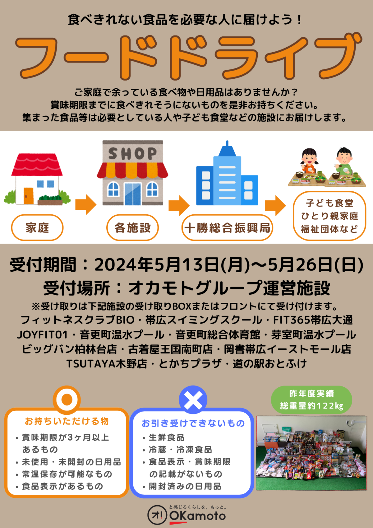 2024年5月13日(月)~5月26日(日)オカモトグループ各運営施設でフードドライブを行います!
