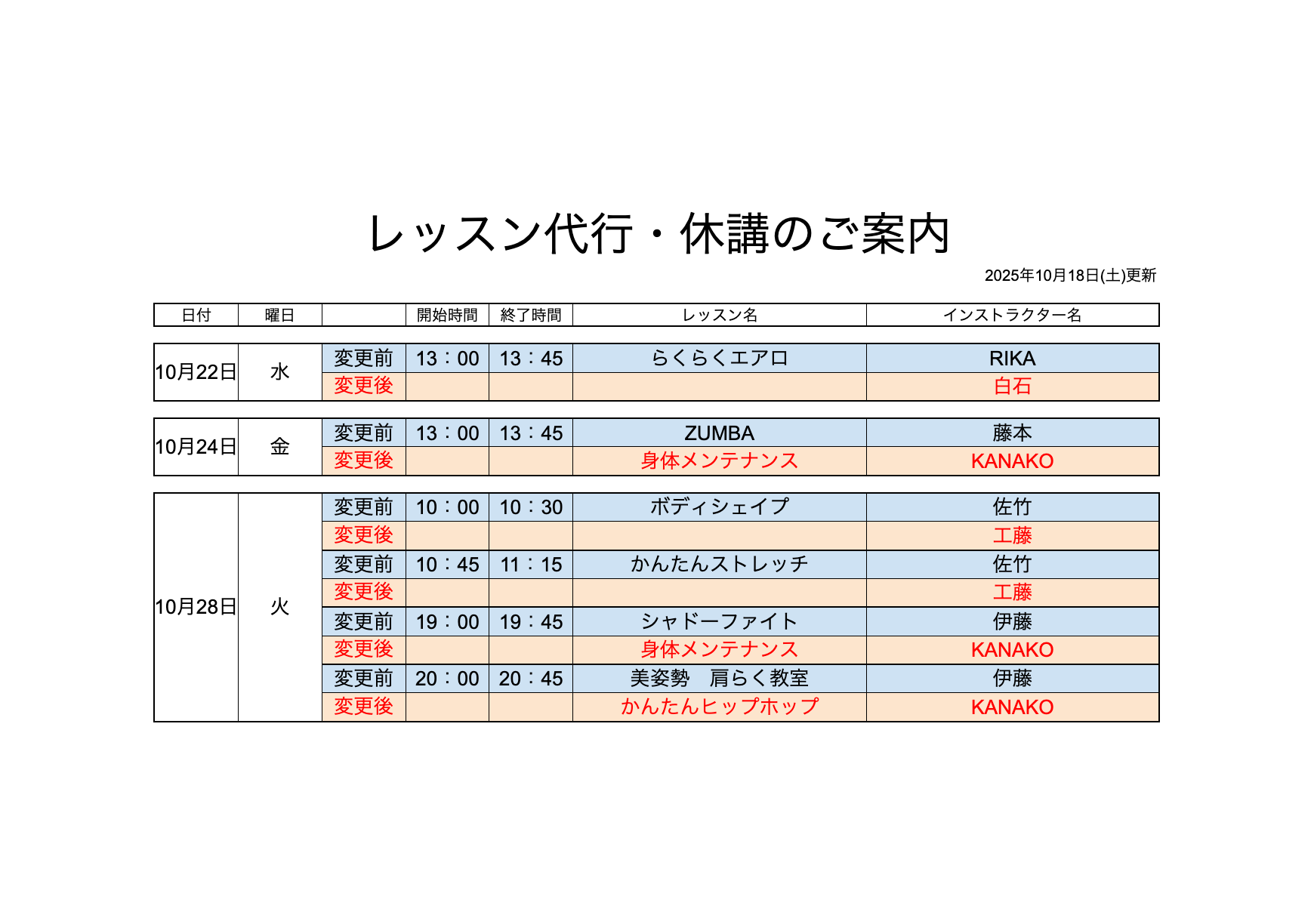 スタジオレッスン代行のお知らせ