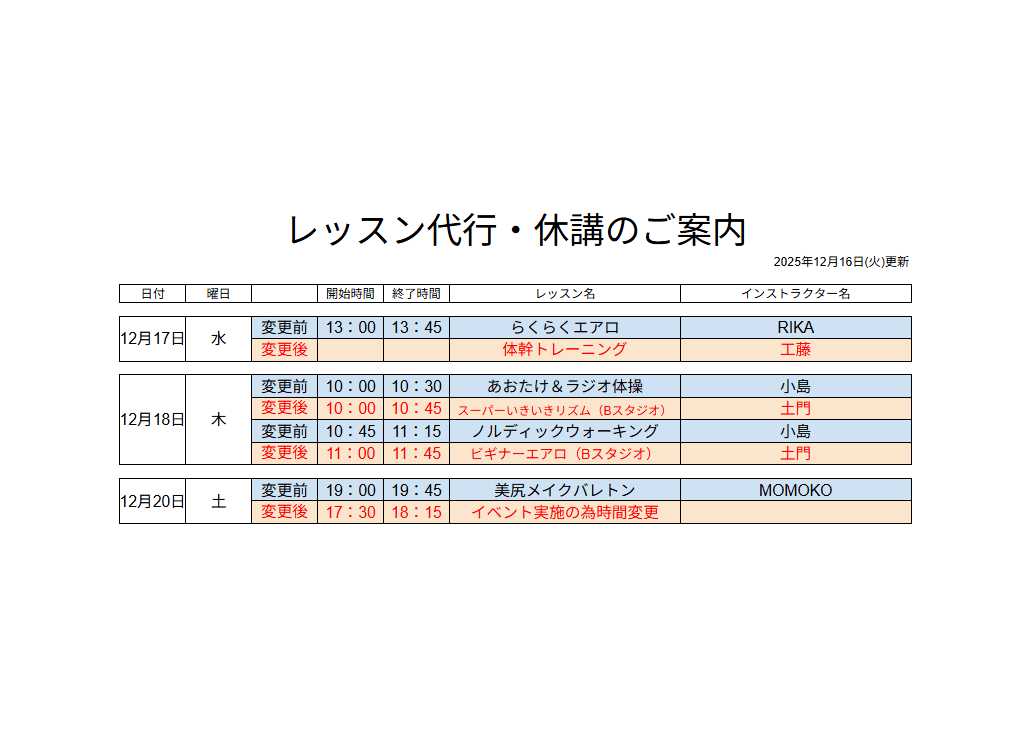 スタジオレッスン代行のお知らせ