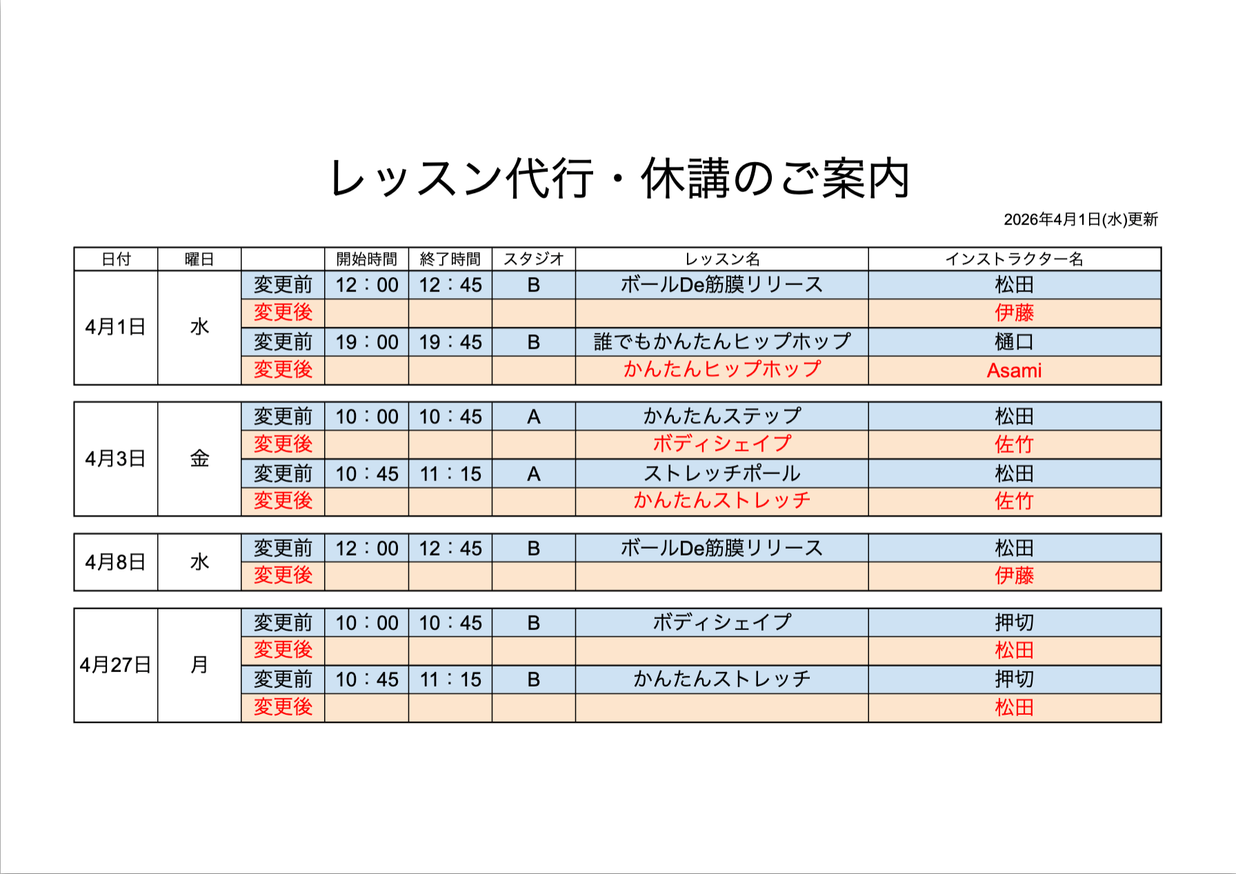 スタジオレッスン代行のお知らせ
