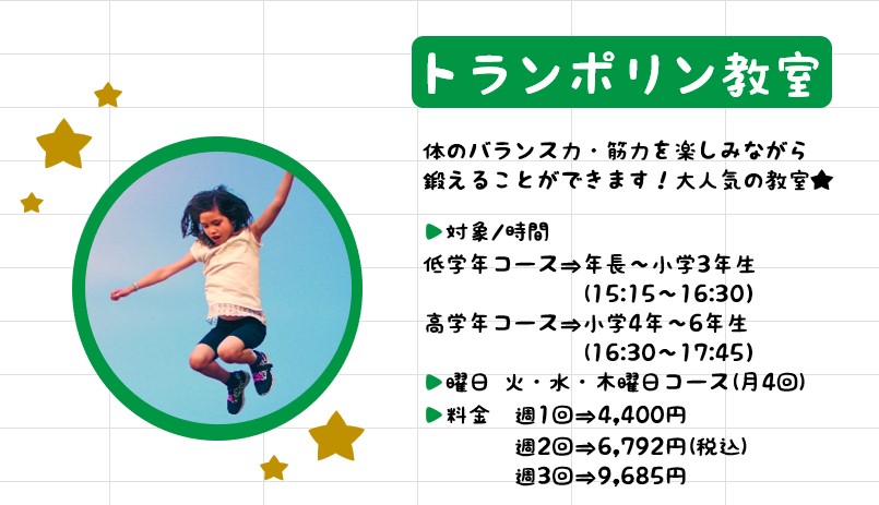 | トランポリン教室 | 火 | 低学年 15:15~16:25 高学年 16:30〜17:40 |