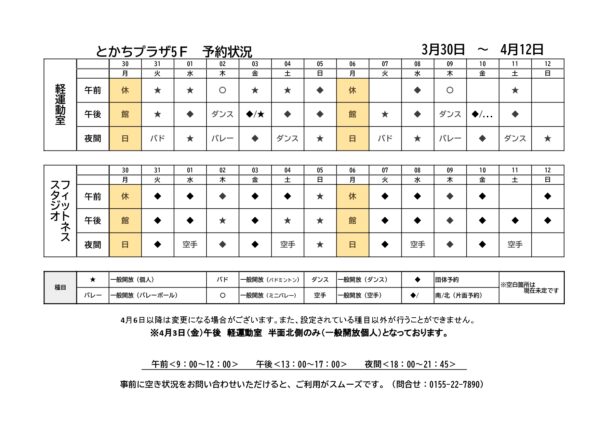 軽運動室・フィットネススタジオ予約状況一覧(3月30日~4月12日)