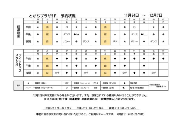 軽運動室・フィットネススタジオ予約状況一覧(11月24日~12月7日)