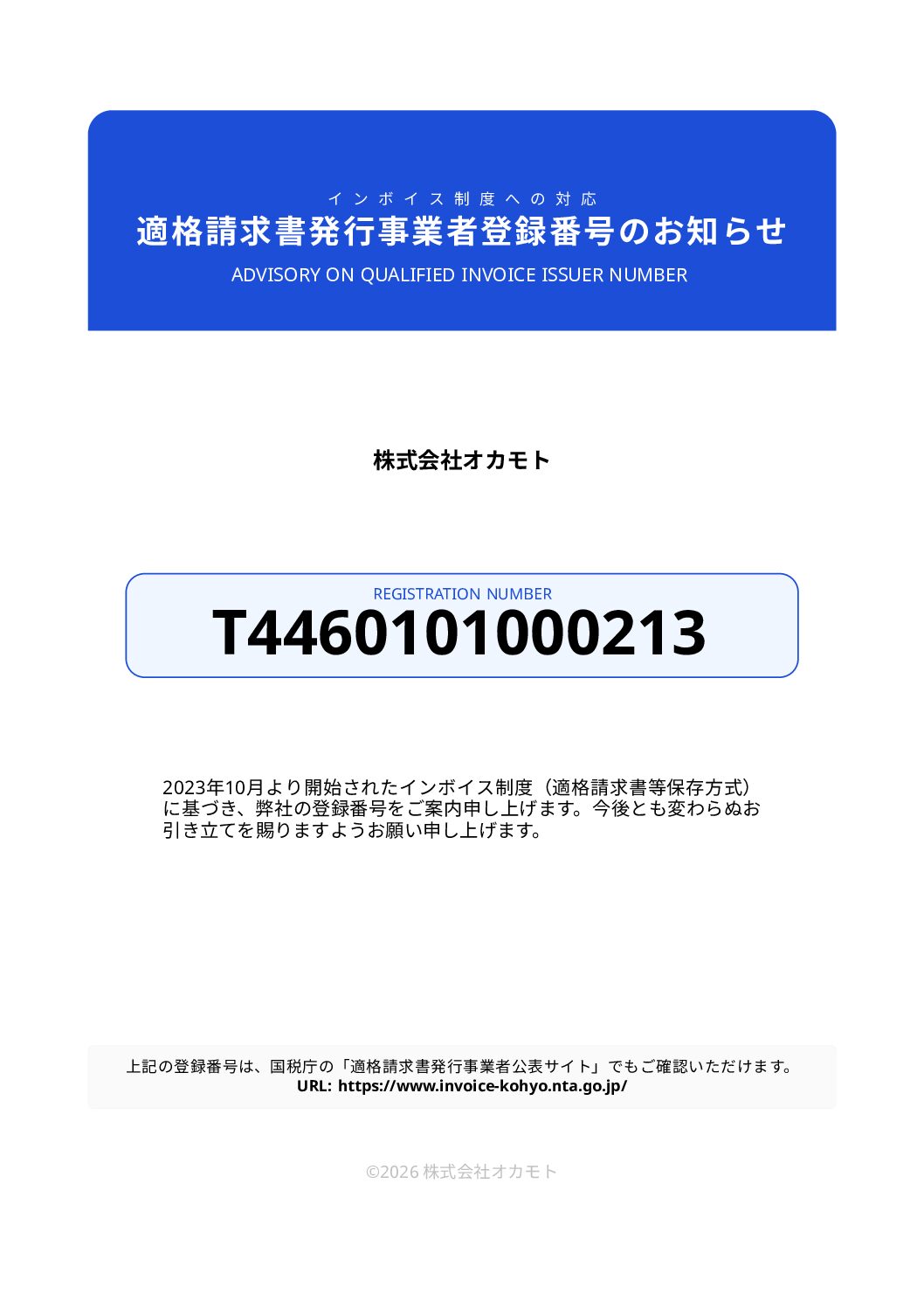 《インボイス》適格請求書発行事業者登録番号のお知らせ