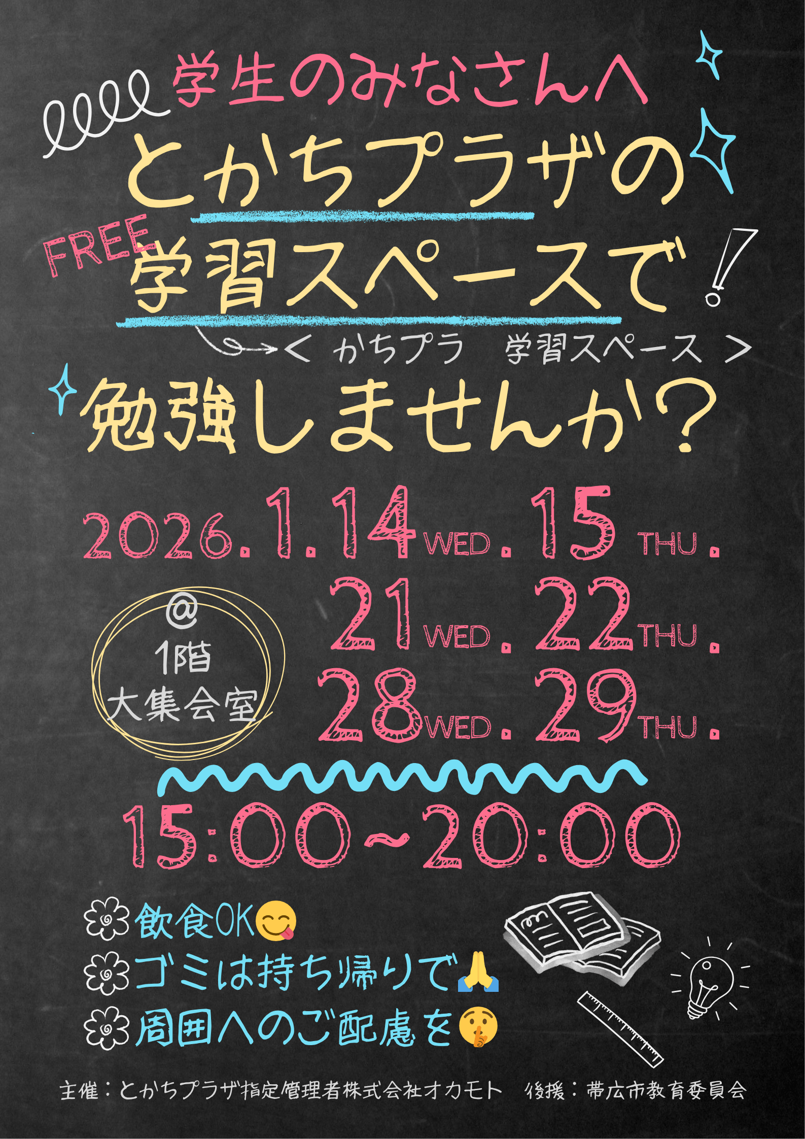 公開日:2026年01月04日(日曜日) かちプラ学習スペース 最新情報を発信しています。フォローしてね! 帯広シニアサークルふたば令和8年度新規入会者へ向けた見学会・体験会 のご案内 とかちプラザの人気の記事 2025年8月21日 キッチンカーに関してのお問い合わせ 2026年1月14日 《インボイス》適格請求書発行事業者登録番号のお知らせ 2025年9月13日 施設貸し切りのお知らせ 2026年1月21日 2026年2案内 2025年12月18日 2026年1月催事案内 2025年11月21日 2025年12月催事案内 2025年10月30日 2025年11月催事案内 2025年9月19日 2025年10月催事案内 知りたい情報をさがす