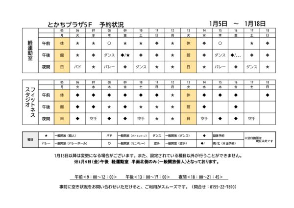 軽運動室・フィットネススタジオ予約状況一覧(1月5日~1月18日)