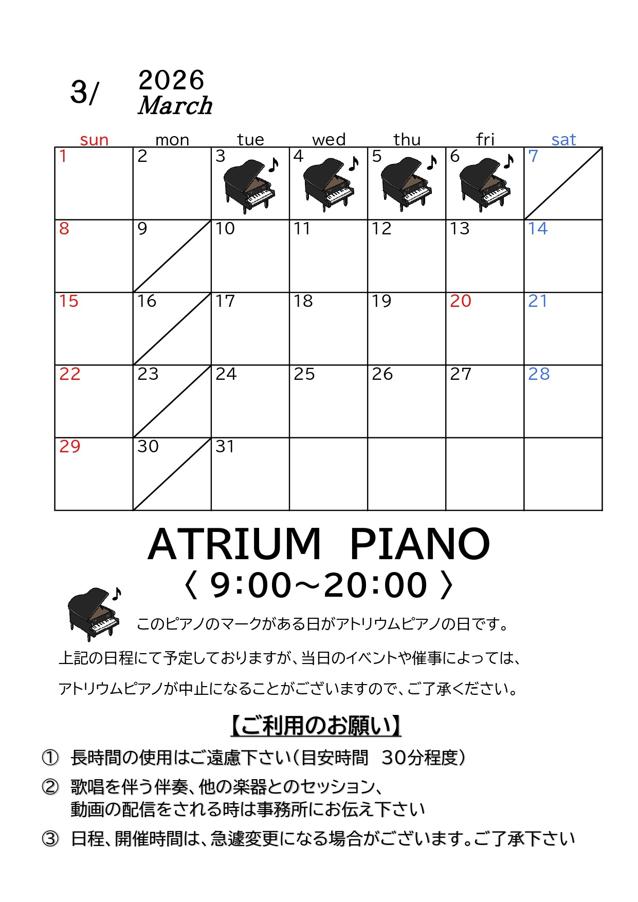 2026年3月~アトリウムピアノ 日程につきまして~