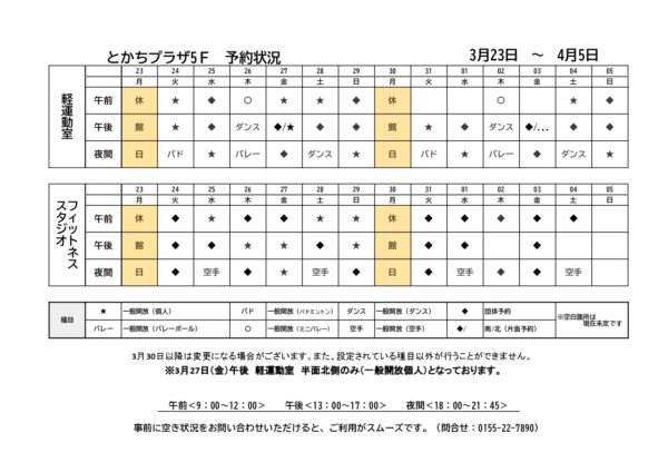 軽運動室・フィットネススタジオ予約状況一覧(3月23日~4月5日)