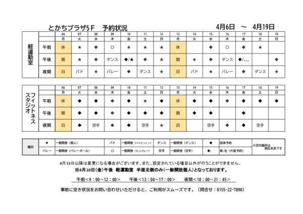 軽運動室・フィットネススタジオ予約状況一覧(4月6日~4月19日)