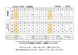 2026年02月15日(日曜日) 最新情報 5階軽運動室 5階フィットネス 軽運動室・フィットネススタジオ予約状況一覧(2月16日~3月1日) ◎とかちプラザで運動しませんか◎ とかちプラザ5階より、軽運動室およびフィットネススタジオ予約状況のお知らせです。 ⚠️ […]