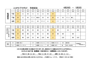 軽運動室・フィットネススタジオ予約状況一覧(4月20日~5月3日)